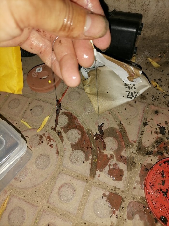 掛蚯蚓的時候也要注意掛法,我一般掛法是:鉤尖從蚯蚓頭部約1公分處扎入,扎滿鉤,并露出鉤尖,這樣能保持蚯蚓在水中活動的時間更長一些,能更好的引誘到鯰魚。