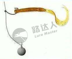 如果找不到專用的倒吊鉛我們可以用其他的掛鉛來代替。使用倒吊釣組時,經常會發生釣線擰轉,解決方法就是使用通心鉛墜或者在倒吊鉛和釣線之間增加一個8字環來解決。這種釣組由于墜處于釣組最下方,所以操控時魚餌的抽動幅度會比較夸張,感覺也比較靈敏,比較適合使用長條型軟餌比如面條蟲一類的仿蚯蚓型的軟餌就是常用于這種釣組上,有一些卷尾的長形軟餌也可。